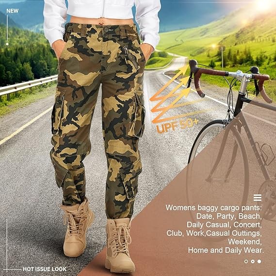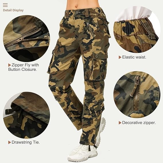 Cargo pants for women sits at waist, loose fit, straight leg, ties at the waist and legs,A comfortable casual pant for outdoor activities and relaxing weekends. Classic camo pants with Multi-Pocket: Women casual loose pants features 8 Pockets include (2) front hand pockets; (2) buttoned cargo pockets; (2) leg pockets; (2) buttoned rear pockets. 95% Cotton,5% Spandex, Sweat-absorbent,Wear and stain resistant Cotton breathe freely, wrinkle resistant, stylish, and stretch fabric for enhanced movement and comfort. These cool girl style cargo pants can be paired with crop tops, basis T-shirts, cool jackets, casual hoodies, high heels, sneakers, etc. for spring, summer, fall and winter.