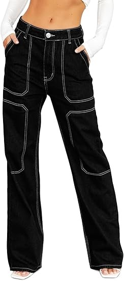 Features: Trendy cargo jean features wide leg, four pockets, contrast color stitches, mid rise, loose fit, button and zipper closure and full length. The unique visible seam line detail adds a touch of individuality and makes you stand out in a crowd Design: Wide leg jean could flatter a variety of leg types, providing ample room for movement and breathability. Cargo pants are versatile and practical addition to any wardrobe, making styling easier with their all-match cargo jeans style Style: Baggy jeans are the key to creating effortless style. Boyfriend jeans are both suitable for everyday wear and for dressing up, and can be easily paired with a tank top, T-shirt, camisole, blouse, sneakers, high heels, and more