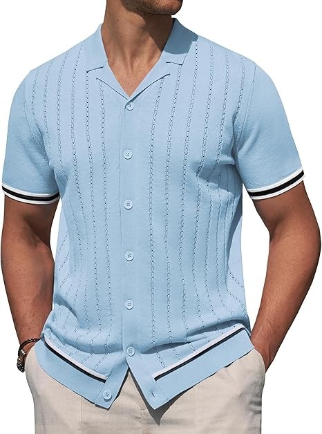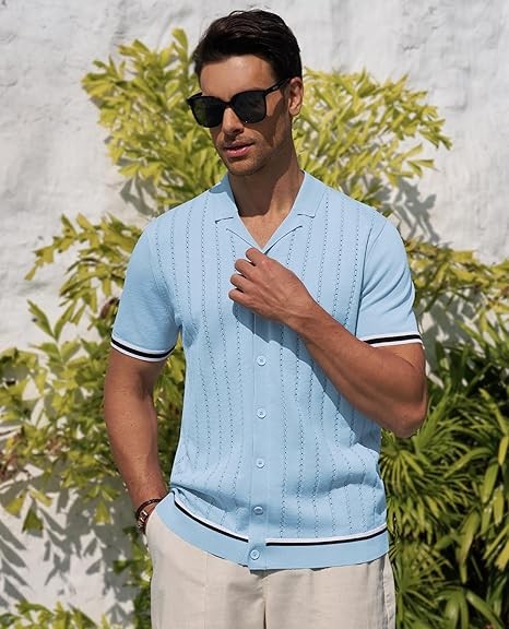 Premium Fabric: The mens dress shirts made of high quality fabric, the fabric is soft, breathable, lightweight, and skin-friendly,allowing the body to move more freely, comfortable Distinctive Contrast Design - Alimens & Gentle Men Casual Button Down Shirt is designed with turn down collar, short sleeve, hallow out design, unique contrast design. Vintage and Simple shape is easy with a showcase of your personal trend match Clothing Match– Men's Short Sleeve Knit Shirt, paired with linen pants, shorts and jeans for casual、vacation look, with T-shirt and tank top as cardigans for daily outfits.Its versatile design ensures a polished look, striking the perfect balance between casual and refined for any occasion Various Occasions– This Men's Knit Button Down Shirt is perfect for a wide range of events, Suitable for golf, vintage cosplay, beach, retro party, 70s/80s/90s prom, vacation, informal business, holiday, dating, wedding, travel, streetwear or any casual daily wear Warm Tips – We recommend washing the Polo Shirt before first use. It can be hand-washed or machine-washed on a gentle cycle. Hang to dry or tumble dry on low. Be sure to check our size chart carefully before placing your order