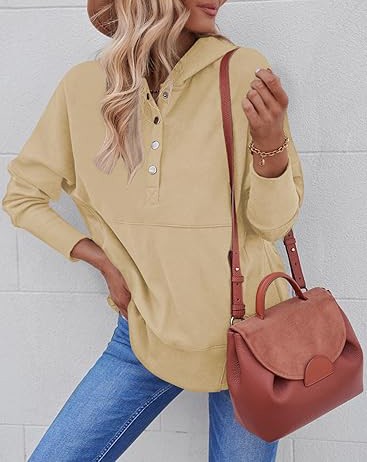 Material: 95% Polyester + 5% Elastane; This trendy cute hoodie top is made of soft and skin-friendly fabric, comfy and comfortable, providing you with a loose and cozy wearing experience. Features: This trendy hoodie sweatshirt for women features long sleeves, a button-down V-neck, a large kangaroo pocket, and an oversized design for a relaxed and baggy appearance. The cuffs, hem, and pocket edges are ribbed for ample elasticity, offering a superior wearing experience suitable for any body type. It's a great addition to your wardrobe. Match:Loose-fitting hoodie tops effortlessly complement various casual bottoms like leggings, pants, jeans, joggers, and shorts, when paired with sneakers or casual shoes, to achieve a stylish and chic appearance during the spring, fall, and winter seasons. Wearing it creates the most beautiful and stylish look. Occasion:This pullover sweatshirt is Perfect for daily, home, school, shopping, going out, club, night out, holiday, weekend, vacation, office, work, date, streetwear, etc.It's also a good gift to your friend or family in spring,fall and winter.