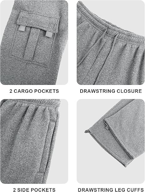 COMFORTABLE MATERIAL: 35% Cotton and 65% Polyester, mens sweatpants made of soft stretch fleece fabric, it’s so comfortable, soft and baggy, loose fit great for outside workout and home around FUNCTIONAL CARGO POCKETS: Two deep side pockets, single back pocket, and two cargo pockets with velco flaps, The fit is very comfortable with plenty of pocket space for wallet, phone and other essentials STYLISH DESIGN: Elastic waistband with adjustable drawstring and drawstring leg cuffs to tighten the bottom. These mens cargo pants are suitable for both men and women, combines fashion and functionality OCCASION: Mens cargo sweatpants great for lounging around, travel days, sports or any situation that you may be looking to be comfortable NOTE: Please refer to the size provided in our picture before buying.For any other questions, please contact us by email