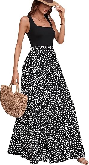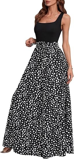 Material:Polyester and spandex.Well made,comfortable fabric.Casual comfy as pajama pants,lightweight and breathable. Design:Dalmatian print,colorblock,sleeveless,square neck,wide leg,empire waist,tank top jumpsuit,with belt,loose and casual style will be your best choice in summer! Occasion:The tank top jumpsuits for women are perfect for spring,summer,fall,going out,beach,vacation,shopping,homeware,date,yoga,party,club,garden party,wedding,cocktail,honeymoon,work,any outdoor or indoor activities. Match:You can pair this color block wide leg pants with variety of shirts,blouses,tunics,sandals,sneakers or heels to complete casual look that's easy to love all season long to show your curves and flatter your body.