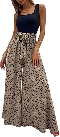 Material:Polyester and spandex.Well made,comfortable fabric.Casual comfy as pajama pants,lightweight and breathable. Design:Dalmatian print,colorblock,sleeveless,square neck,wide leg,empire waist,tank top jumpsuit,with belt,loose and casual style will be your best choice in summer! Occasion:The tank top jumpsuits for women are perfect for spring,summer,fall,going out,beach,vacation,shopping,homeware,date,yoga,party,club,garden party,wedding,cocktail,honeymoon,work,any outdoor or indoor activities. Match:You can pair this color block wide leg pants with variety of shirts,blouses,tunics,sandals,sneakers or heels to complete casual look that's easy to love all season long to show your curves and flatter your body.