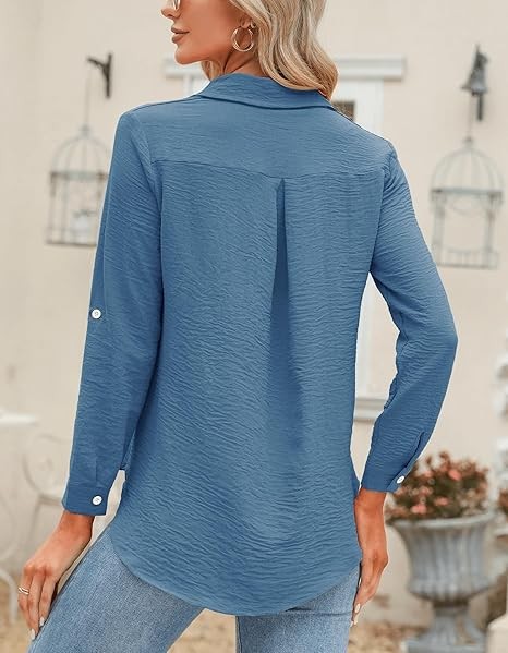 Womens Button Down Shirts V Neck Rolled Up Long Sleeve Tops Elegant Dressy Blouses Business Casual Outfits