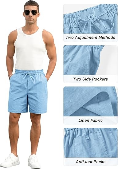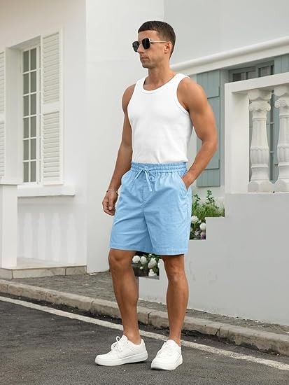 Mens Cotton Linen Shorts Casual Drawstring 7inch Inseam Shorts Stretch Summer Beach Wear