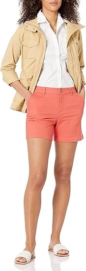 STRAIGHT FIT: Slim fit through the hip and thigh, straight through the thigh and leg opening. Also offered in Curvy sizes for a curvier fit through the hip and a narrower waist. STRETCH COTTON TWILL: Washed for softness, this cotton twill is naturally breathable and has a bit of stretch for comfort and flexibility. CLASSIC KHAKI SHORT: These classic Khaki shorts are the ultimate summer style. Offering a clean, gently structured silhouette, these shorts also fit with comfort and ease for at work, weekend exploring, or running errands. Complete your look with Essentials Women's Sneakers or Sandals.